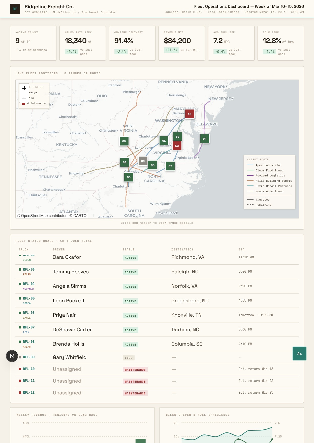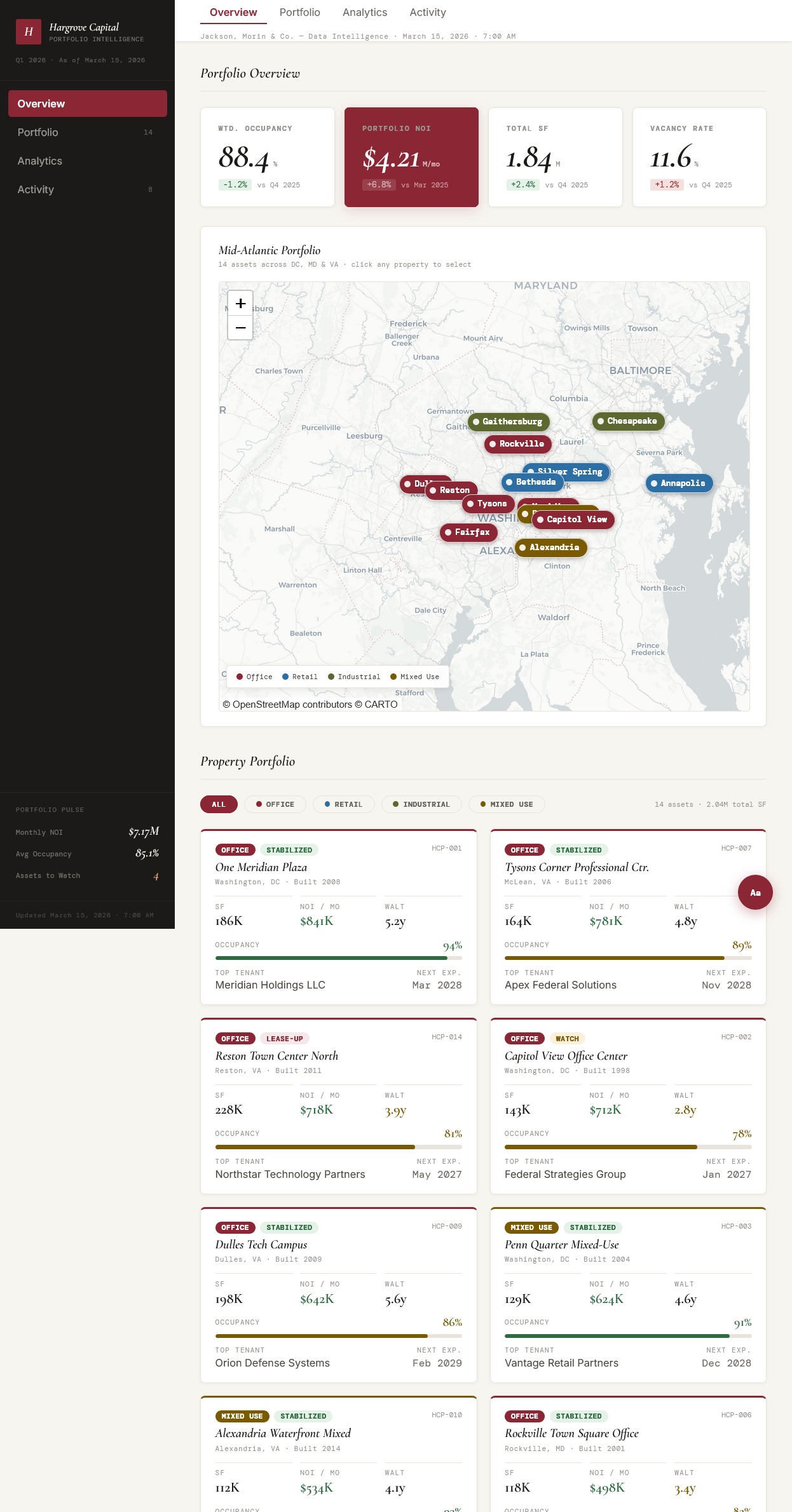Analytics, operations, CRE portfolio, fleet management — different industries, different data, same underlying build. Drag or click to explore each layer.